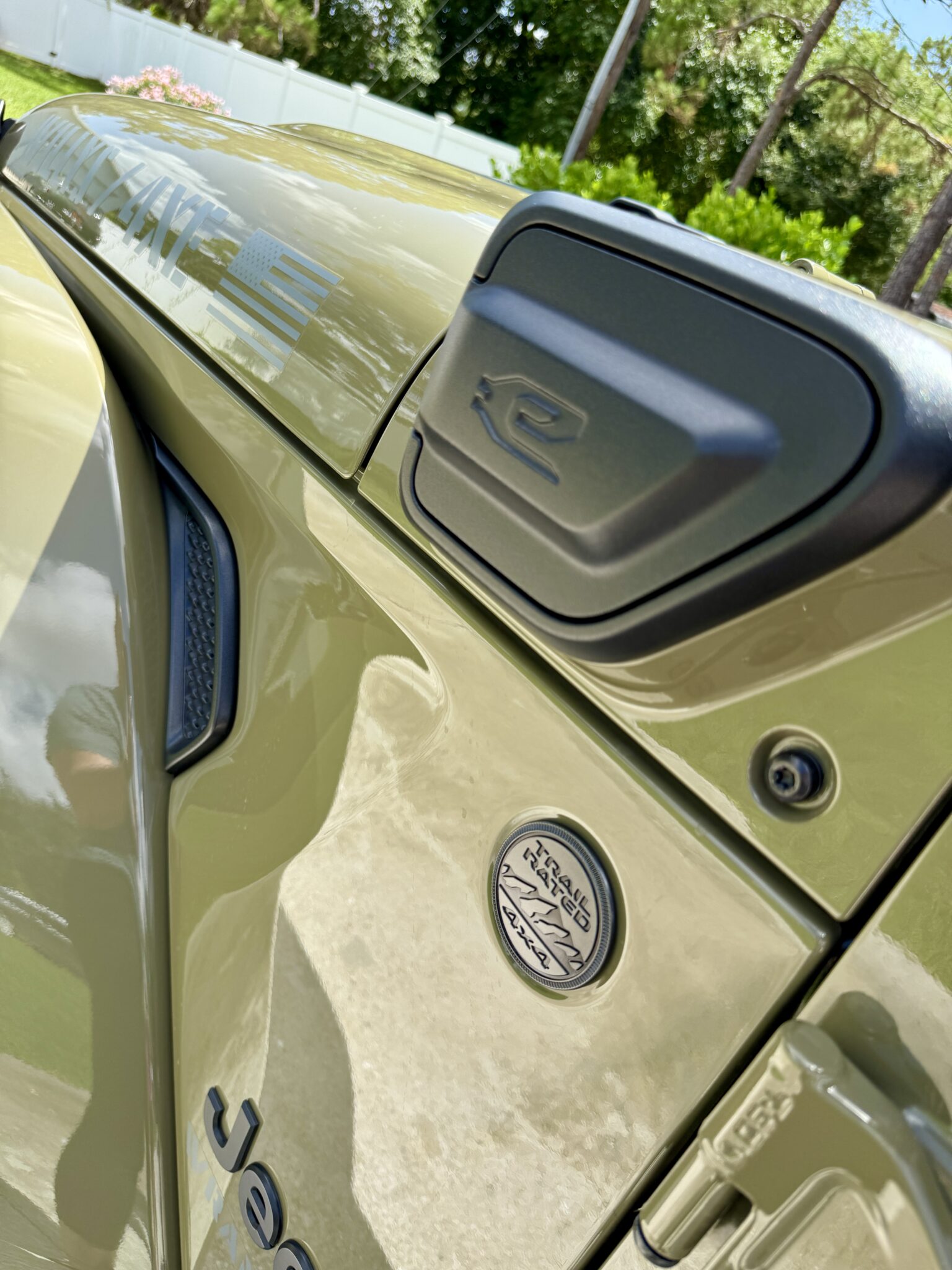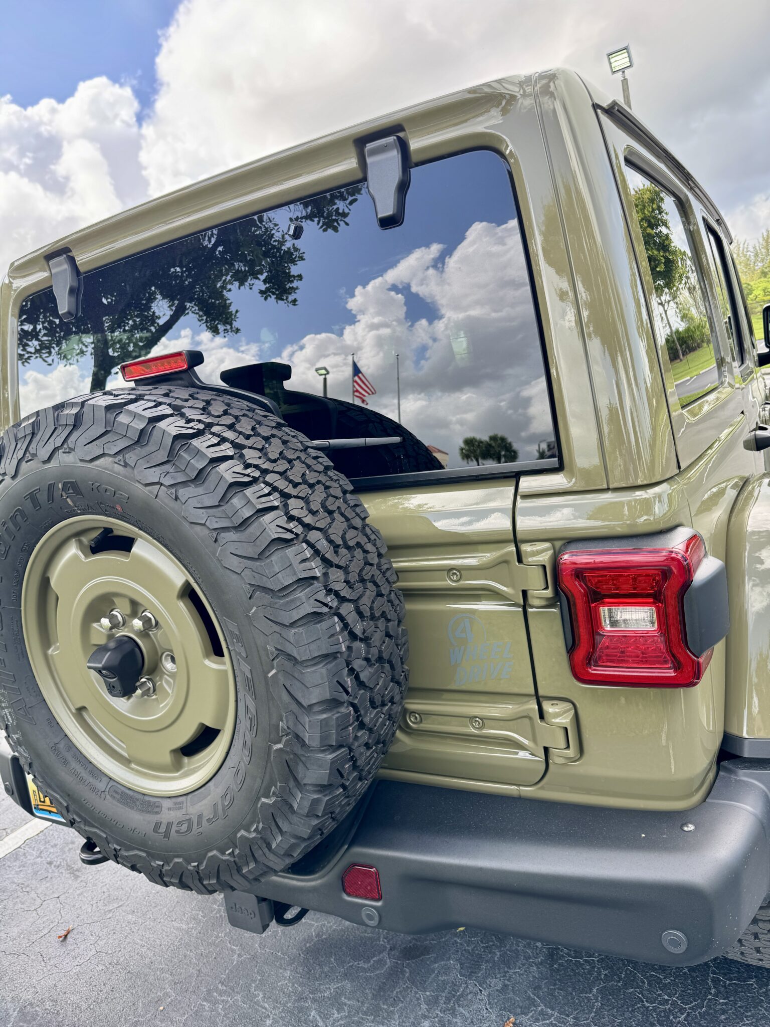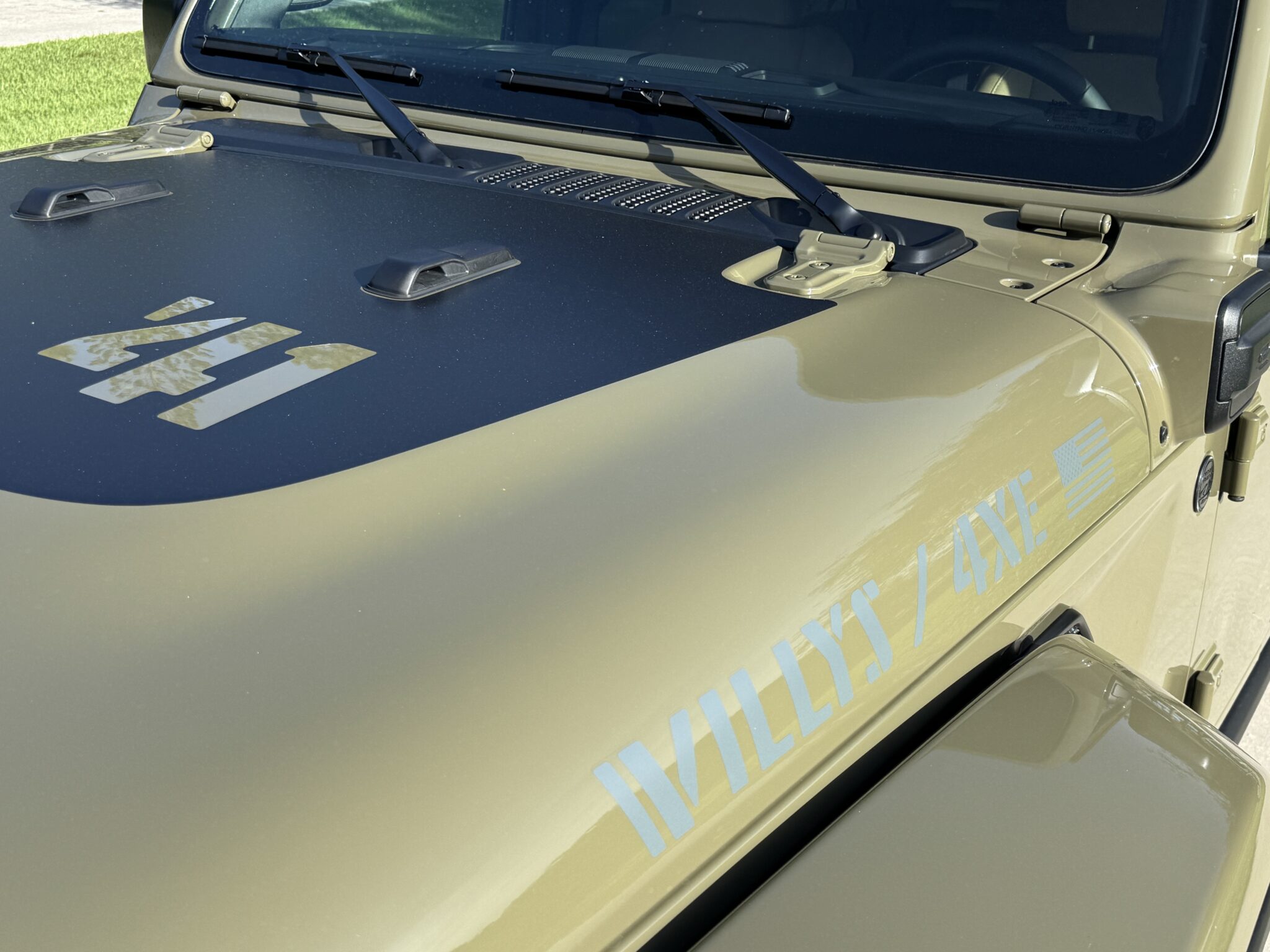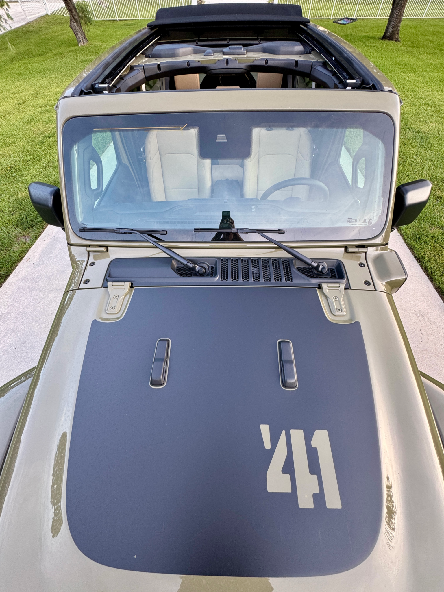 This new plug-in hybrid is a tribute to the original 1941 Willys MB, combining old-school military style with the latest technology from Stellantis. The ’41 Edition is all about the details, and one thing that really stands out is the color – a classic Olive Drab paint job that’s a perfect army green shade. It’s not just the body that’s painted this way, either – the roof and wheels are all covered in the same vintage hue, giving the whole vehicle a really cool, retro look. The flat black ’41 hood decal and black accents (grille, door handles, fuel door, bumpers) are a perfect contrast to make the green look even better.