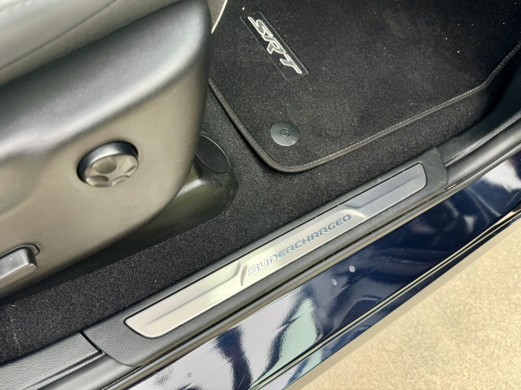 Let’s talk about the spec, because this one was styled perfectly. The exterior was coated in a deep navy blue, set off aggressively by a flat black roof. Opening the door reveals a stunning white interior detailed with gold stitching outlining the SRT Hellcat logos on the seats. Throw in the forged carbon dash accents and the Alcantara steering wheel—which gives you the exact tactile grip you want when wrangling this much horsepower—and the cabin feels like an absolute premium powerhouse. I would have loved brass monkey wheels over the silver, but that’s the only change I’d make to this one.